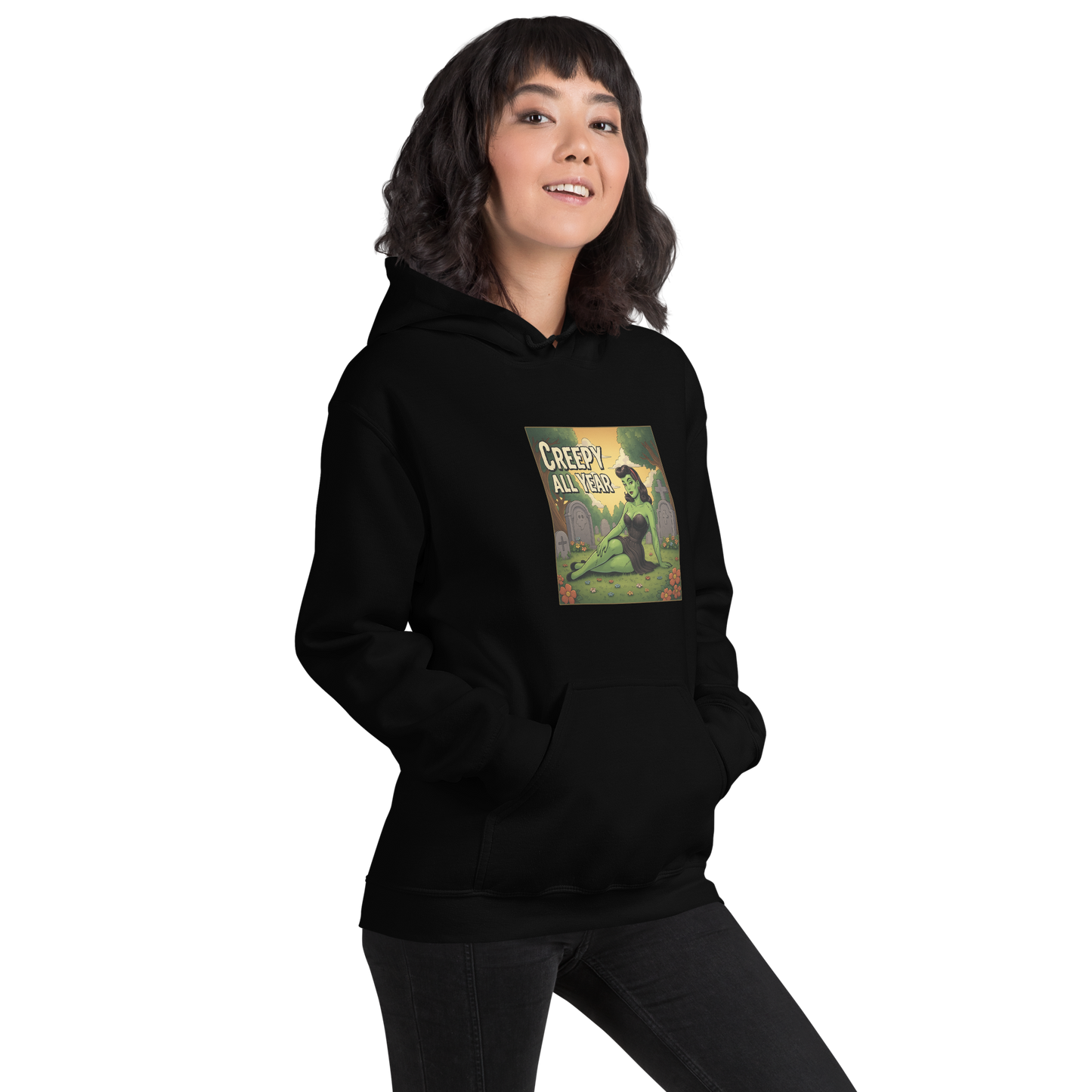 💀🌸 She’s drop-dead gorgeous and hauntingly serene, meet the Cemetery Siren, the undead queen of graveyard glam! Lounging among the tombstones with vintage flair and charm, she proves that creepy can be cute all year long. 🖤🪦