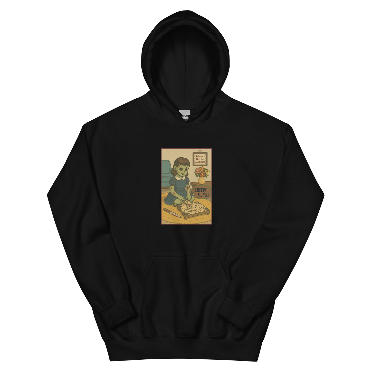 This little ghoul just clocked out of school and into the spirit world. With her Ouija board ready and summer vibes strong, it’s playtime... with the paranormal. Summoning Starts Now 🔪📚👻✨